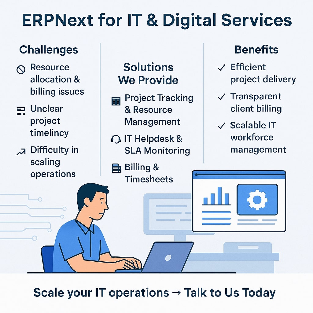 The IT & Digital Services sector is fast-paced, project-driven, and highly dependent on efficient resource allocation. Challenges like unclear timelines, billing disputes, and difficulties in scaling operations often disrupt growth. At Blivora Tech, we implement ERPNext solutions tailored for IT companies, startups, and service providers—helping you manage projects, monitor SLAs, streamline billing, and scale your workforce with ease.