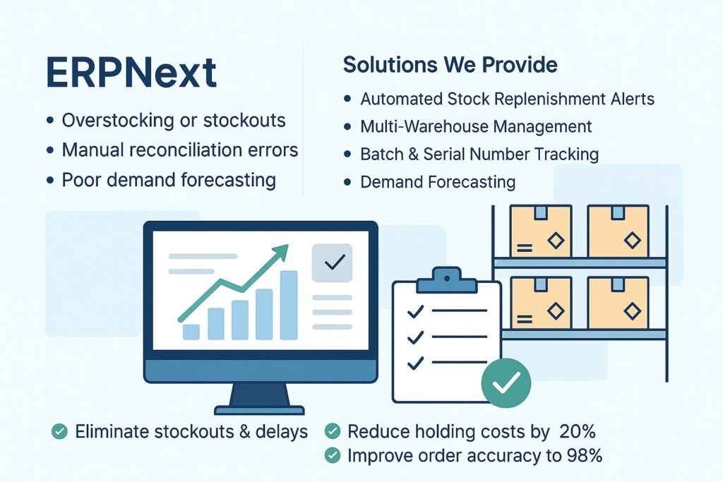 Managing stock effectively is critical to business profitability. Yet, many organizations still struggle with stockouts, overstocking, manual errors, and poor demand forecasting. At Blivora Tech, we implement ERPNext solutions that give you real-time inventory visibility, automated replenishment, and smart forecasting tools—so you always stay ahead of demand.